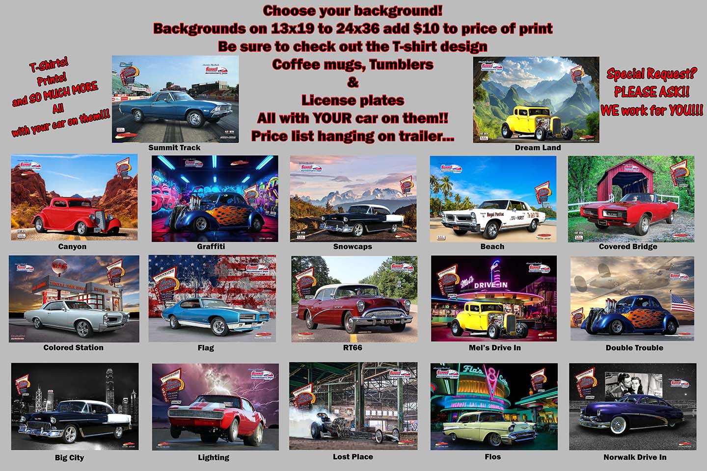 3 choices of t-shirts, backgrounds change to match your car!